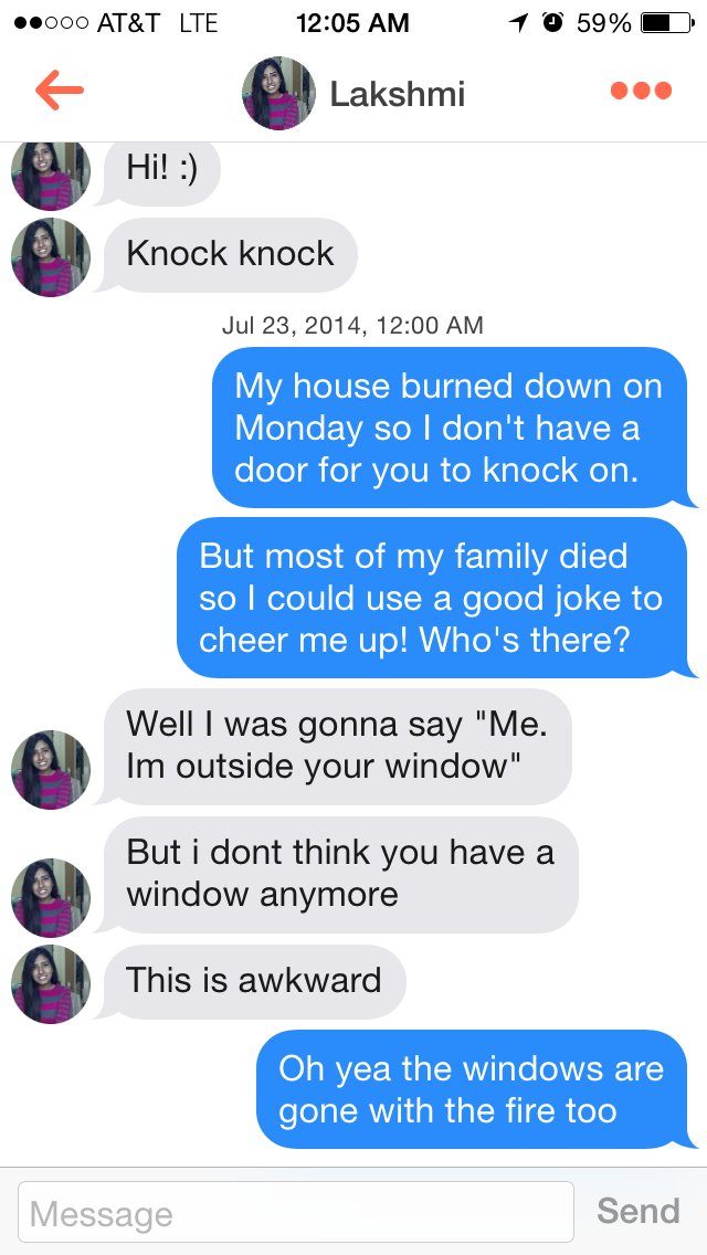 Top posts october 26th 2015 top posts of october, 2015 top posts 2015. Al give you a kiss if you open this door! 7 funniest knock knock jokes for kids of 2021. The best jokes for tinder. Sometimes women could have bios similar to this: I am a simple and diligent girl. 5 bad knock knock jokes of 2021. Though some people might find it boring, they are certainly amazing. Best knock knock joke reply i have received. Sorry not sorry but really sorry. A community for discussing the online dating app tinder. Candice be love i'm feeling right now? A big list of tinder jokes!